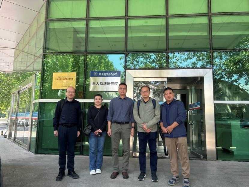 培训结束后,团队又专程赴北京航空航天大学无人系统研究院考察学习。北京航空航天大学无人系统研究院是我国无人系统领域的重要科研与教学基地。研究院聚焦无人系统技术发展前沿,组织开展天、临、空、海、陆、潜无人系统技术发展研究、关键技术攻关、系统设计、集成验证等研究工作,是多学科交叉融合、研究与研制一体化发展特色的高水平无人系统研究平台。在考察过程中,该院飞行器总体及气动布局设计研究专家梁煜教授向公司教师详细介绍了北航"低空技术与工程"新专业的人才培养体系和北航低空经济产业与技术研究中心,并安排实地观摩考察了国家无人系统重点实验室。调研团队就实验室在无人机智能导航、集群协同控制等领域的科研成果转化机制,以及校企协同育人模式、实践教学平台搭建等问题与梁教授进行了深入探讨和交流。期间,双方初步达成共建员工科创实践基地的合作意向。