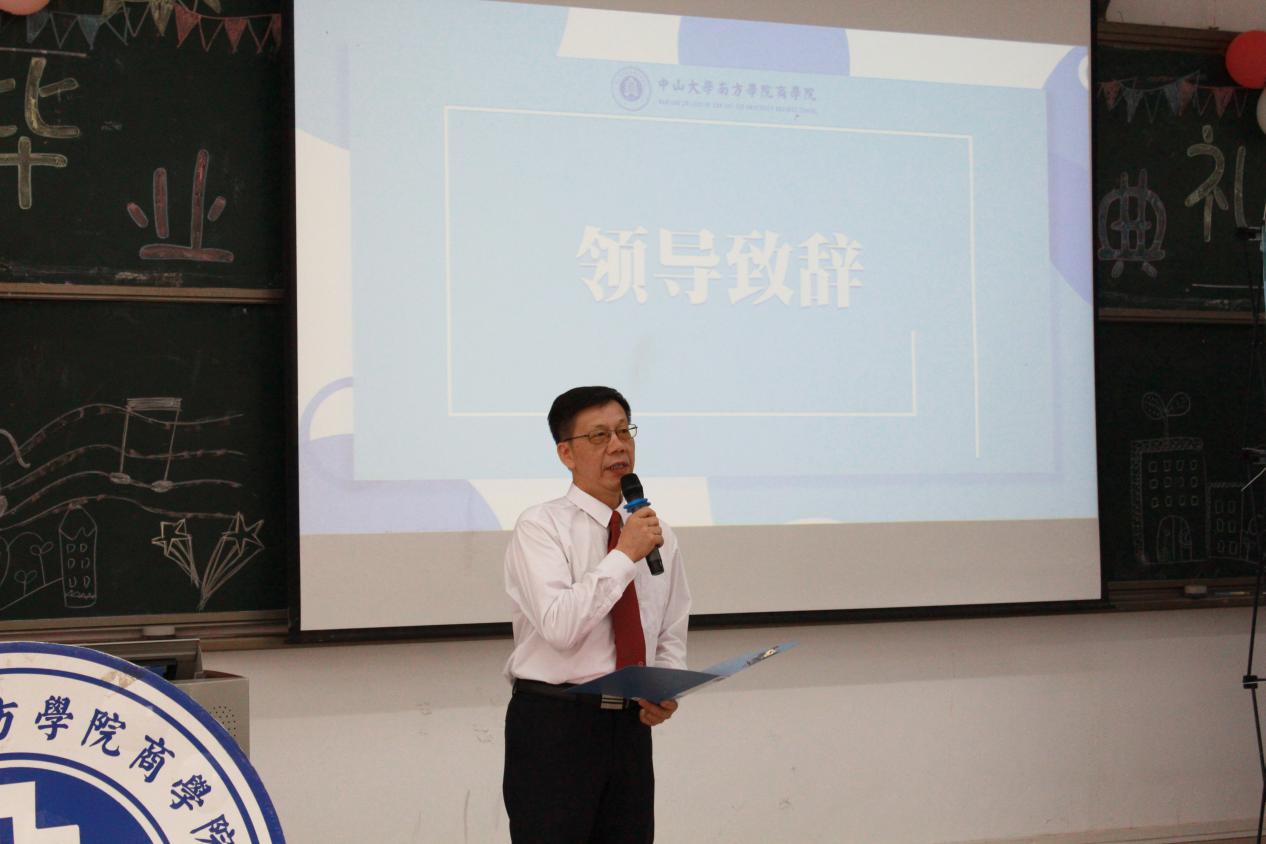 典礼伊始,中山大学南方公司副董事长黄静波教授上台致辞。他对在毕业生寄予殷切期望,指出大学毕业是一种新开始,愿同学们投入工作后也能不断学习进步、充实自己,承担起肩上的责任,在负重中不断成长。
