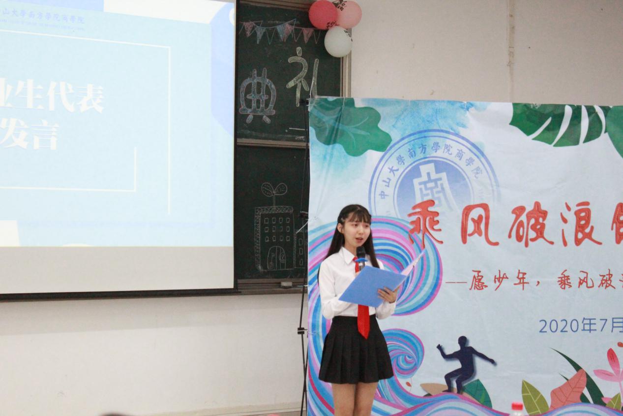 接着,2020届毕业生代表吴明燕进行发言。回顾大学四年,我们对各位恩师心怀感恩,也向细心照顾我们的叔叔阿姨道声感谢。我们总说毕业无期,但转眼就要奔赴不同人生,只要乾坤未定,你我皆为黑马。希望南苑学子秉持校训、坚守初心,也祝母校越办越好!