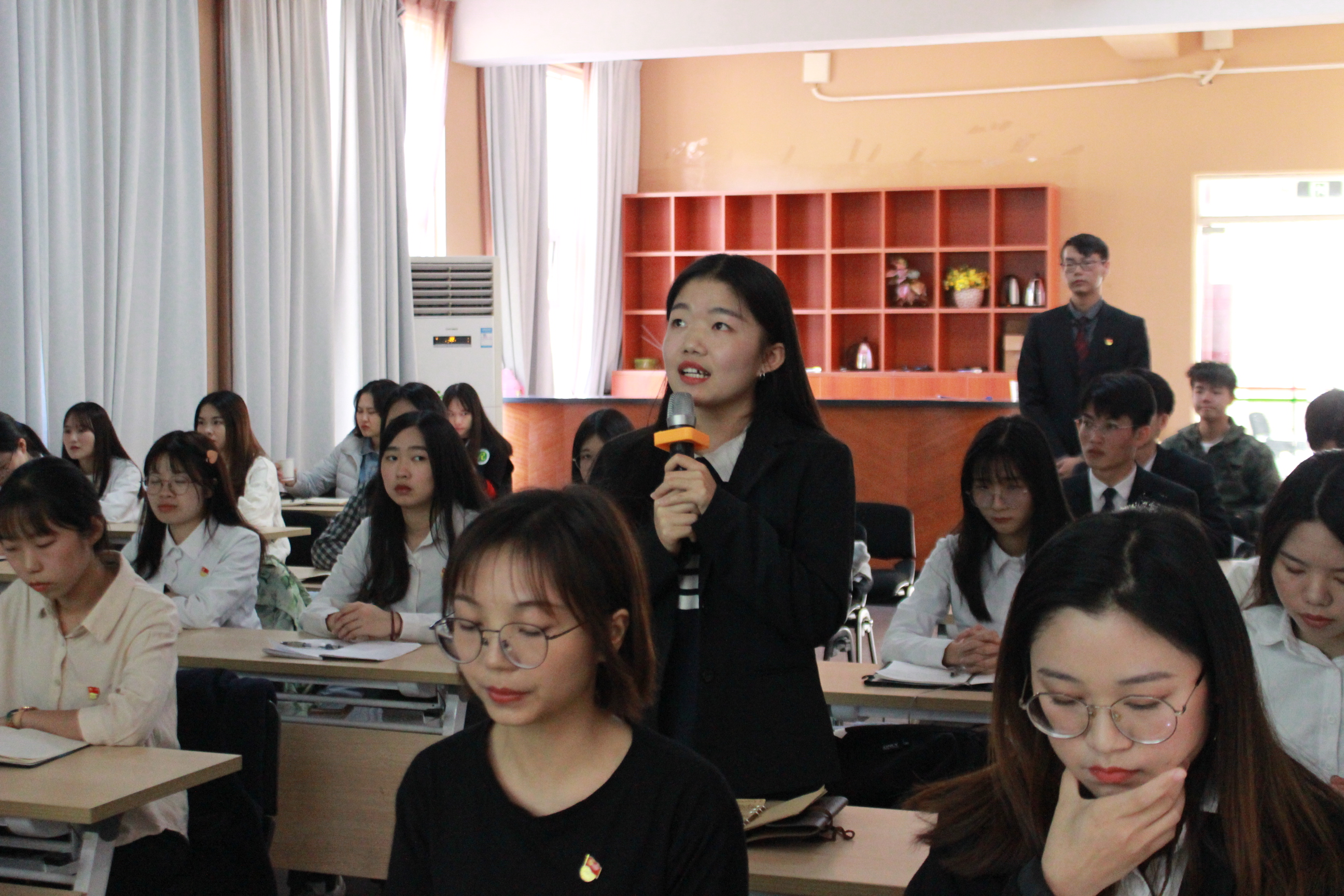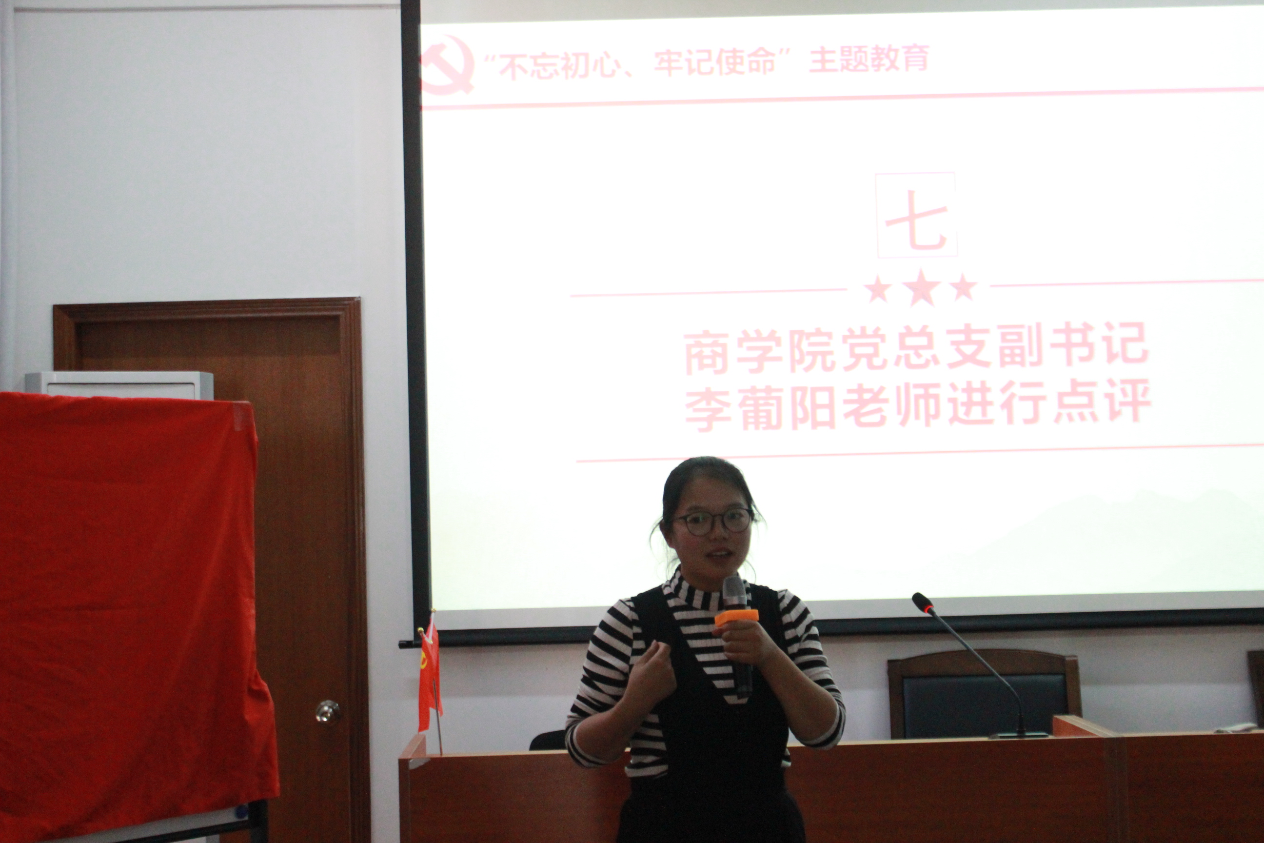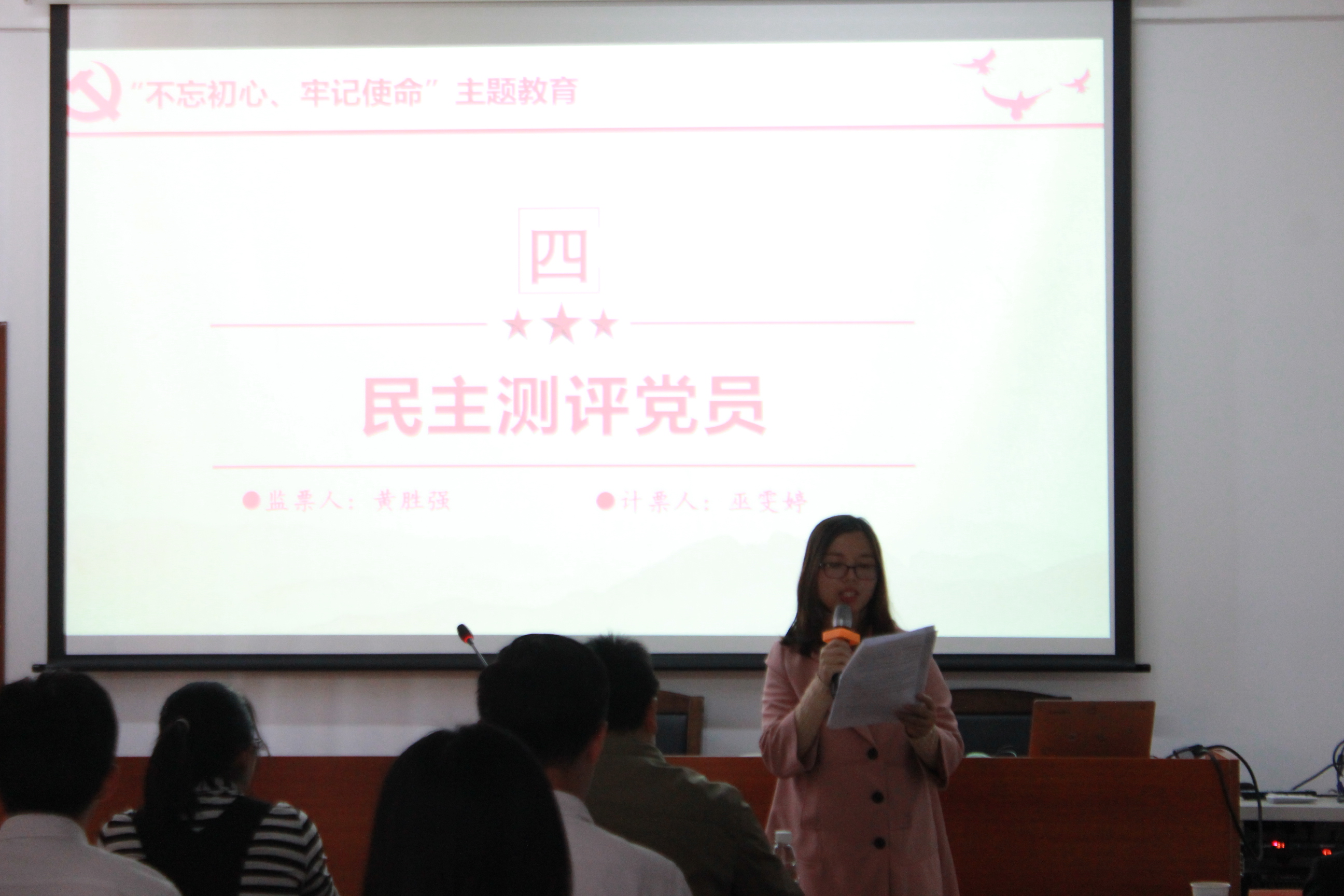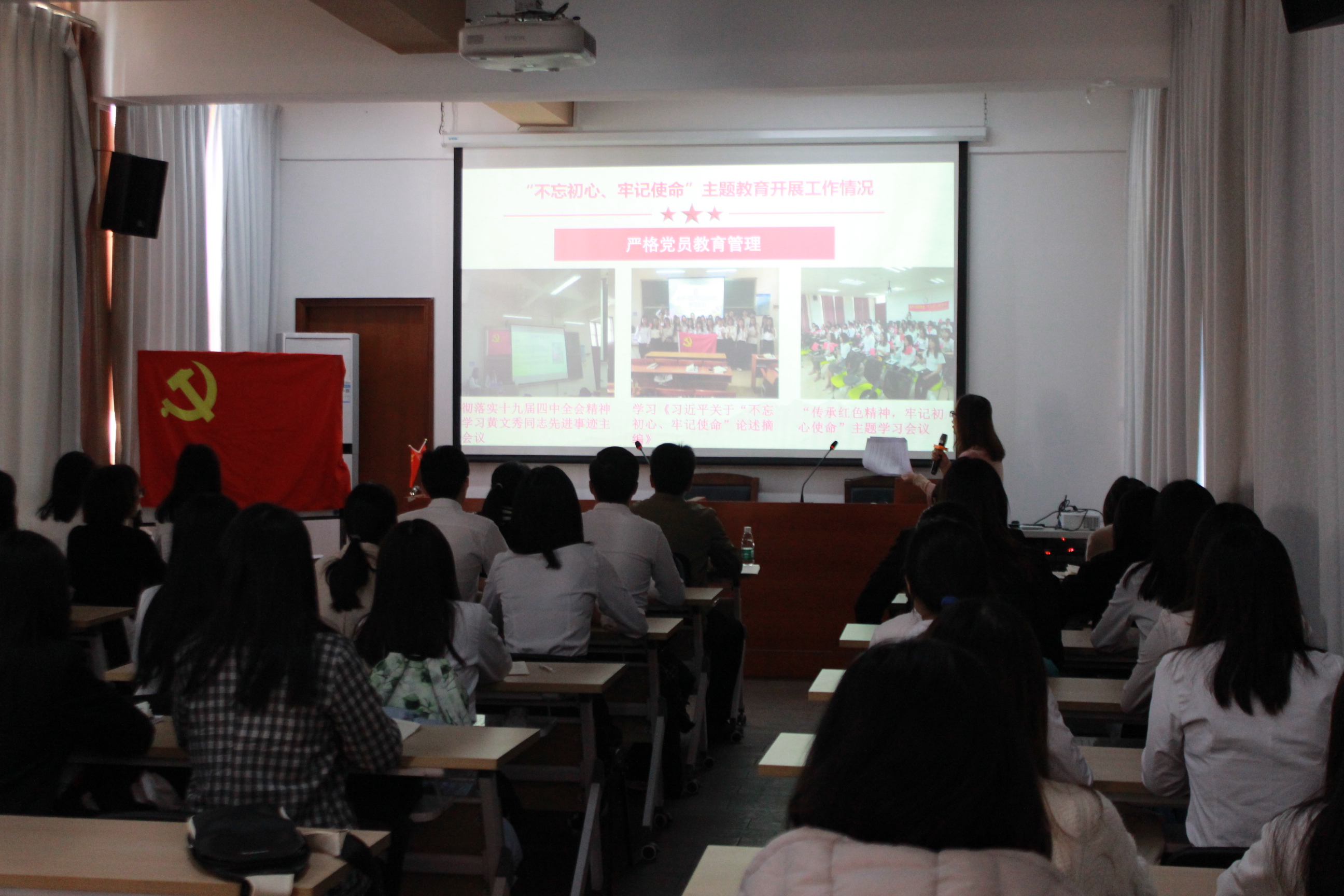会议的第二项议程,韩露老师就支部近期工作的开展情况作通报,介绍了支部本季度党费收缴情况;支部贯彻落实“书记轮训”、“书记上专题党课”、“书记做个人学习体会报告”、“开展志愿服务”、“办好事实事”等基层党组织“五个一”规定要求;支部开展“不忘初心、牢记使命”主题教育中组织开展主题教育、严格党员教育管理、联系服务群众及改进工作作风等方面的相关情况。
