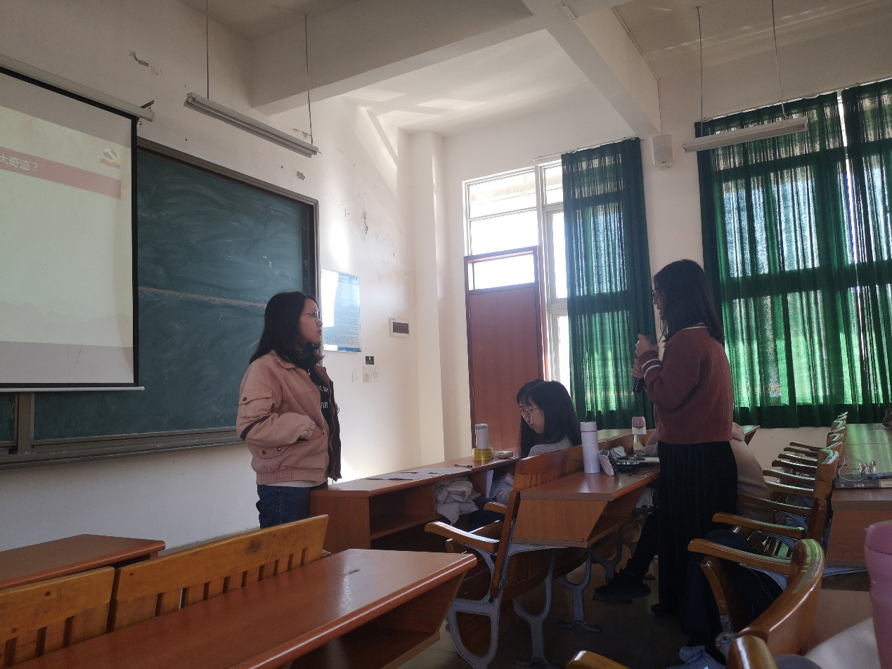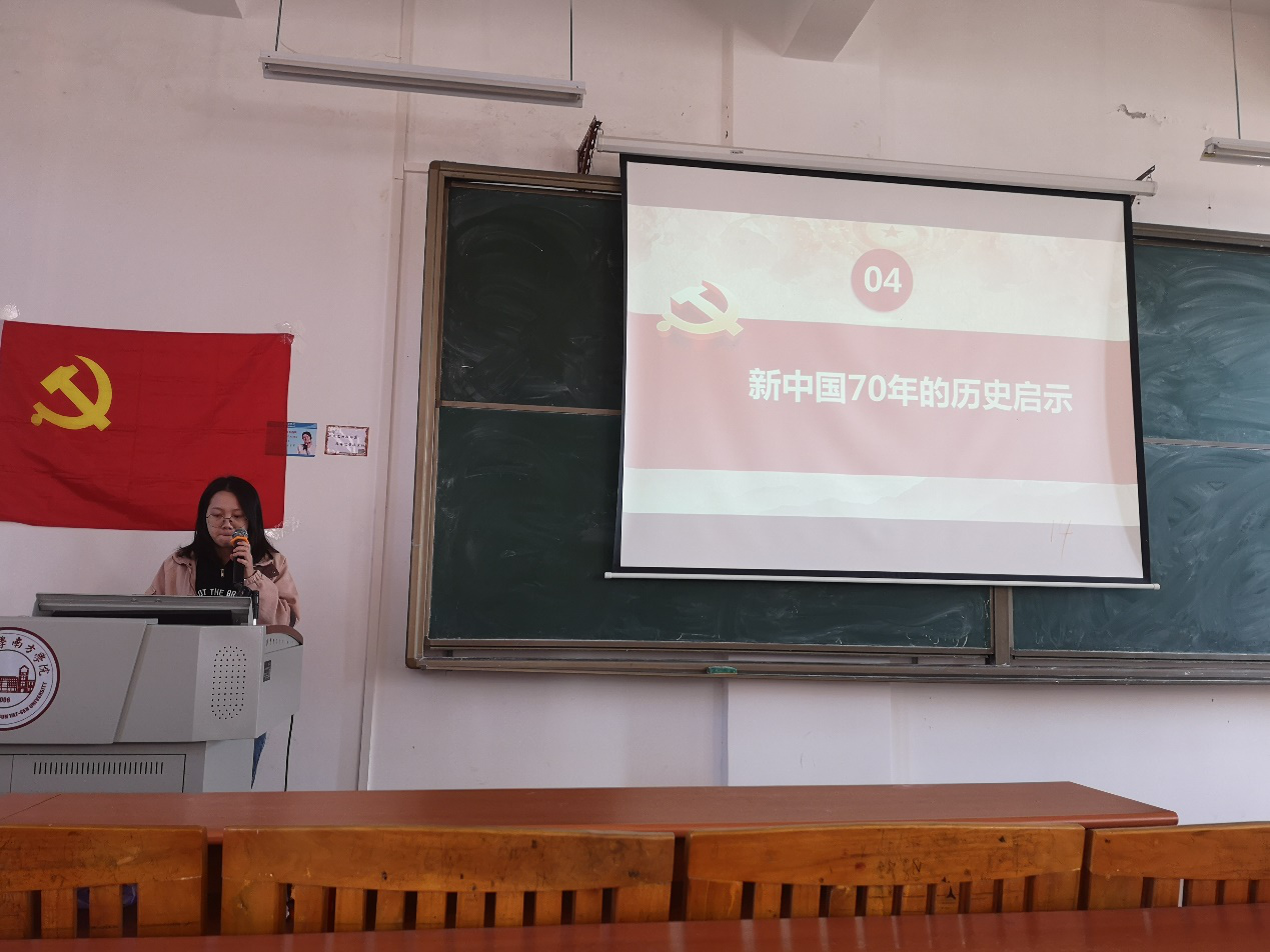 最后,主讲人邬佩莹同志引用了革命先驱李大钊的话:“无限的过去都以现在为归宿,无限的未来都以现在为渊源。”历史是最好的教科书。70年来,中国为什么能走过光辉历程、创造伟大奇迹?归根结底是因为有中国共产党的领导,我们党始终坚持把马克思主义基本原理同中国具体国情相结合,不断推进马克思主义中国化,形成中国特色社会主义道路、理论、制度、文化。