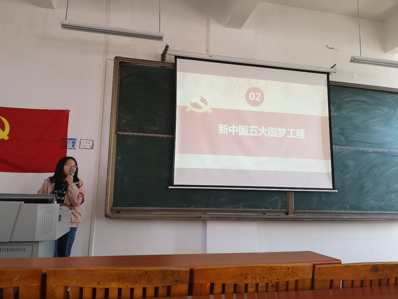 针对“不忘初心、牢记使命,我与祖国共奋进”的主题学习,主讲人邬佩莹同志就五个部分展开宣讲。第一个部分为新中国十大成就,第二个部分为新中国五大圆梦工程,第三个部分为70年来的生活巨变,第四个部分为新中国70年的历史启示,第五个部分为壮丽70年奋斗新时代。在介绍的过程中,邬佩莹同志采取“提问”的方式来让积极分子回答有关祖国发展的相关问题,这不仅加深了他们对祖国的认识,而且为今后二支部培养积极分子提供了一个新方向。