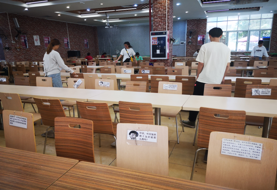 活动开始前,小组成员集思广益,决定活动主题以“从小事中体现美好与温暖”延伸开来,餐厅——作为一个公众场合,在饭堂就餐过程中的行为举止体现出一个人的礼仪,经过调查,活动小组成员注意到餐厅的桌凳在用餐结束后经常摆放不齐,这不仅给工作人员增加了工作难度,也为其他人带来了不便。于是,为了美化食堂的用餐环境,以实际行动号召大家一起做有礼貌讲文明的人,小组成员最终确定了主题活动的地点——中区饭堂。