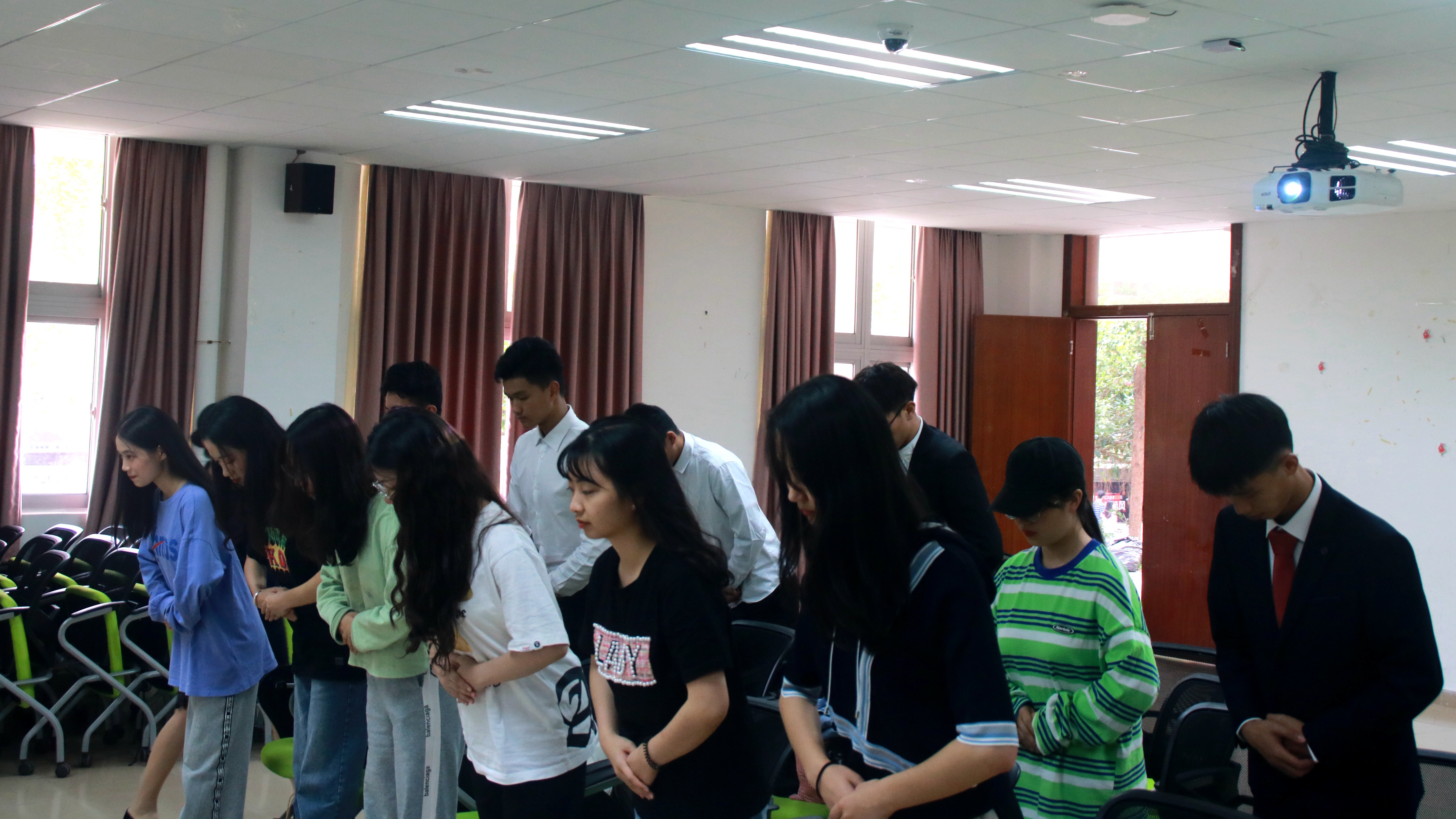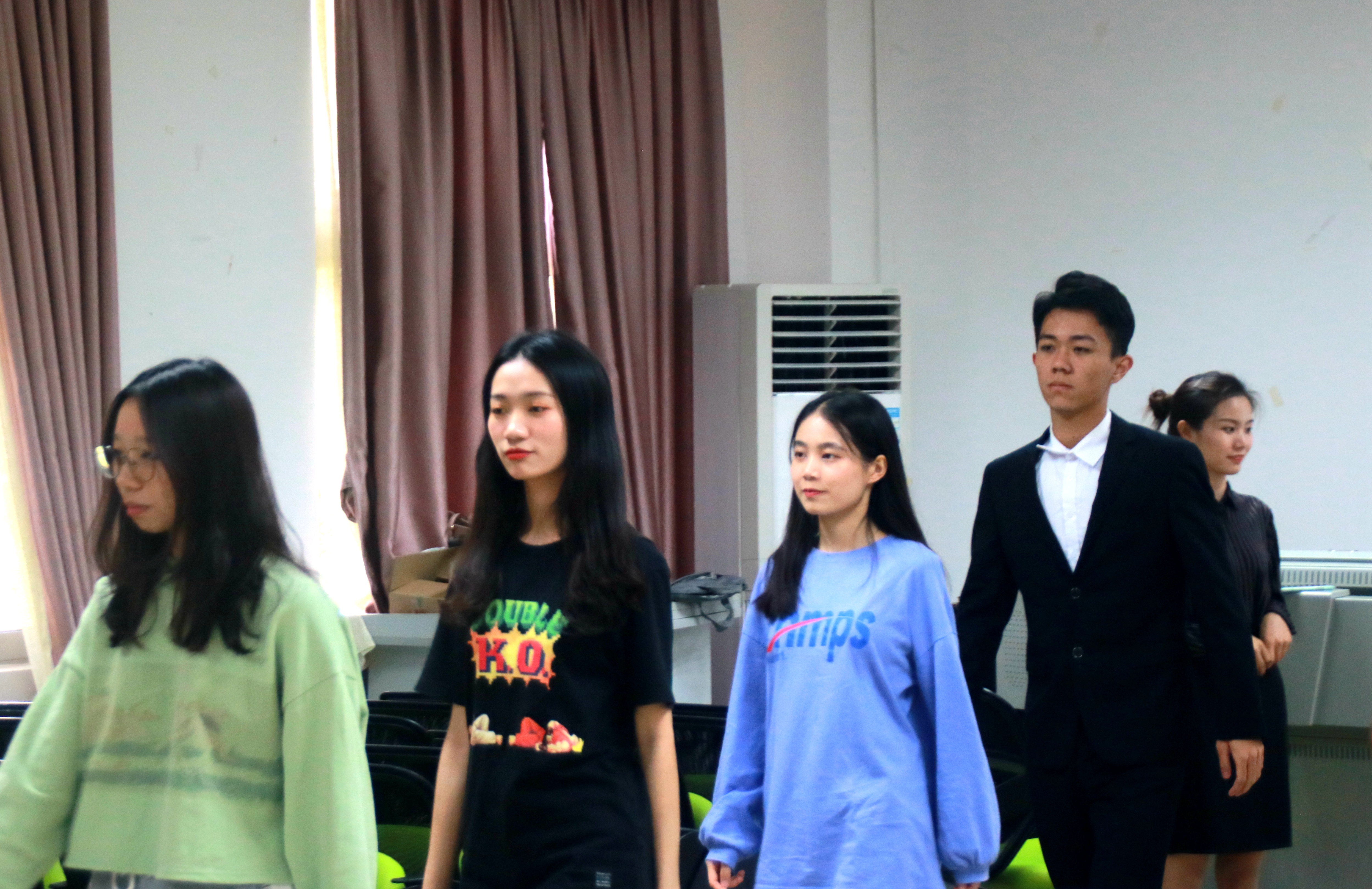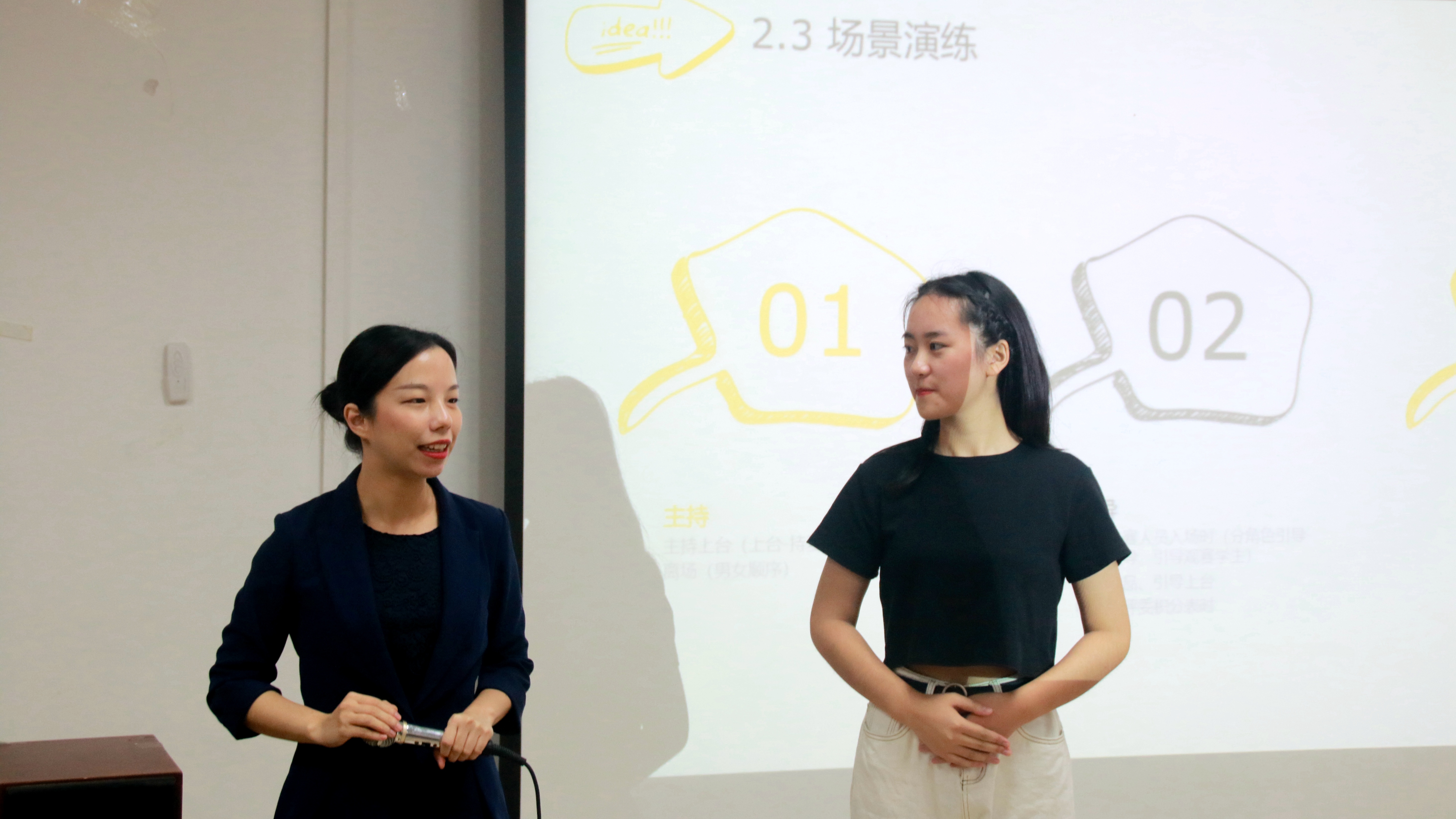 针对行为规范的练习过后,朱老师对同学们的现场引导也给出相应的场景的练习。场景共分为三个部分,第一部分是主持人上场到开场的演练,第二部分为引导嘉宾入场的情景,第三部分是引导领导嘉宾颁奖和离场的场景。