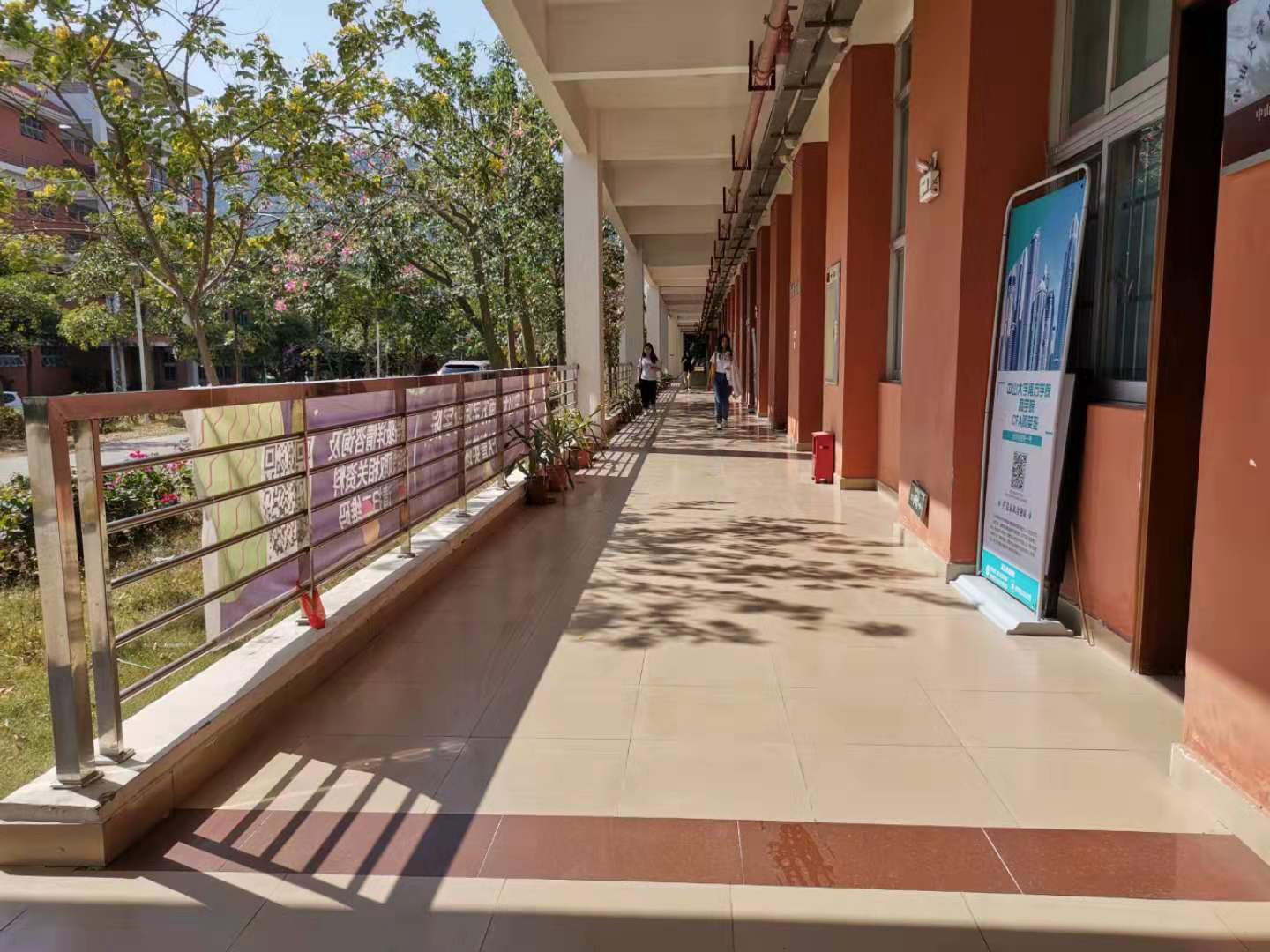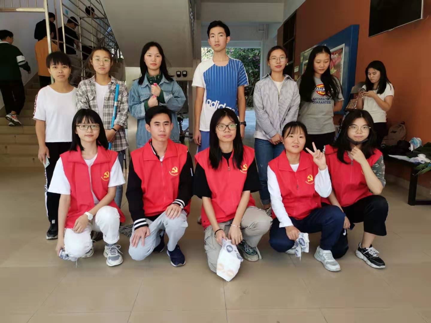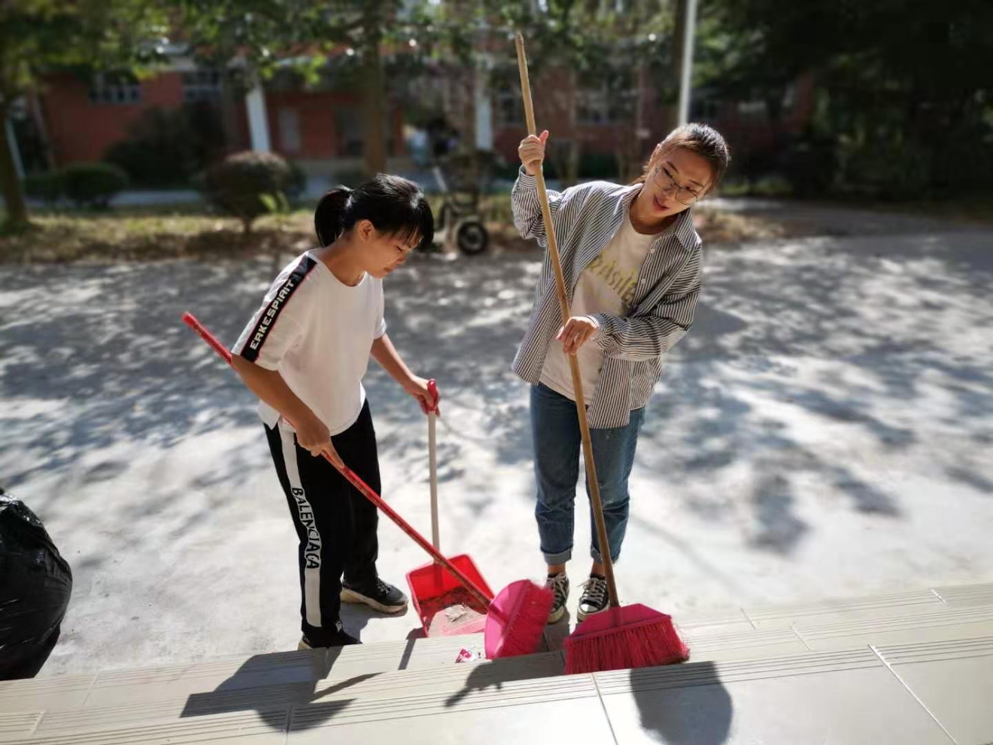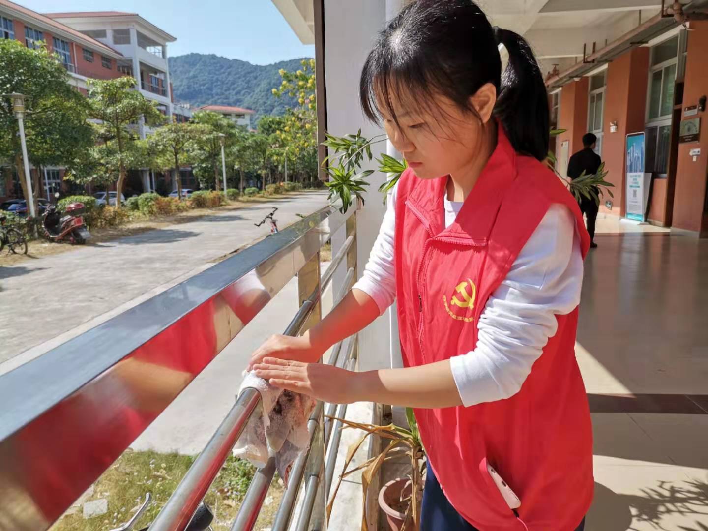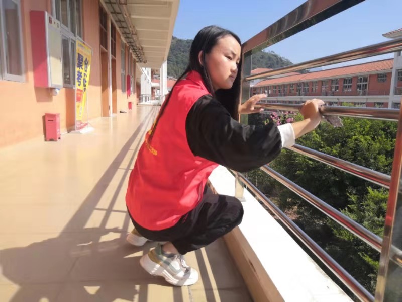 经过积极分子们高效努力的清洁,走廊上不再有散落的树叶和杂乱的纸屑,栏杆上不再有点点的灰尘与水渍。走廊和栏杆仿佛重新焕发出它原先该有的色彩和光芒,积极分子身上的红马甲也愈发明亮。