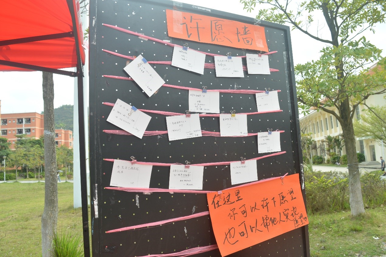 17电商一班的摊位旁放置着留言帮助板,同学们能参加趣味游戏、在留言板上粘贴明信片,书写内容可为积极向上的口号、也可以是想要实现的心愿。若愿意伸出援手的有缘人在此驻足,即可取下对应明信片,帮助完成心愿!