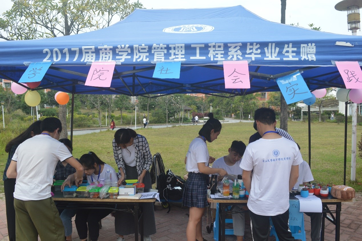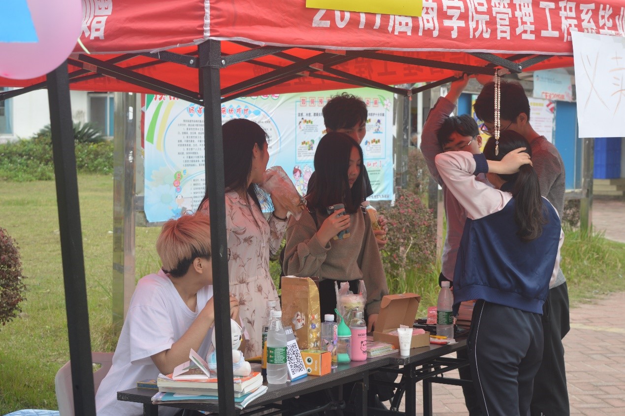 首先,让我们跟随镜头,将视线落在东区饭堂门前。在这里,17电商一班、17金工一班、18物流一班及太阳城娱乐社会实践部,分别开设的四个摊位相对而立。