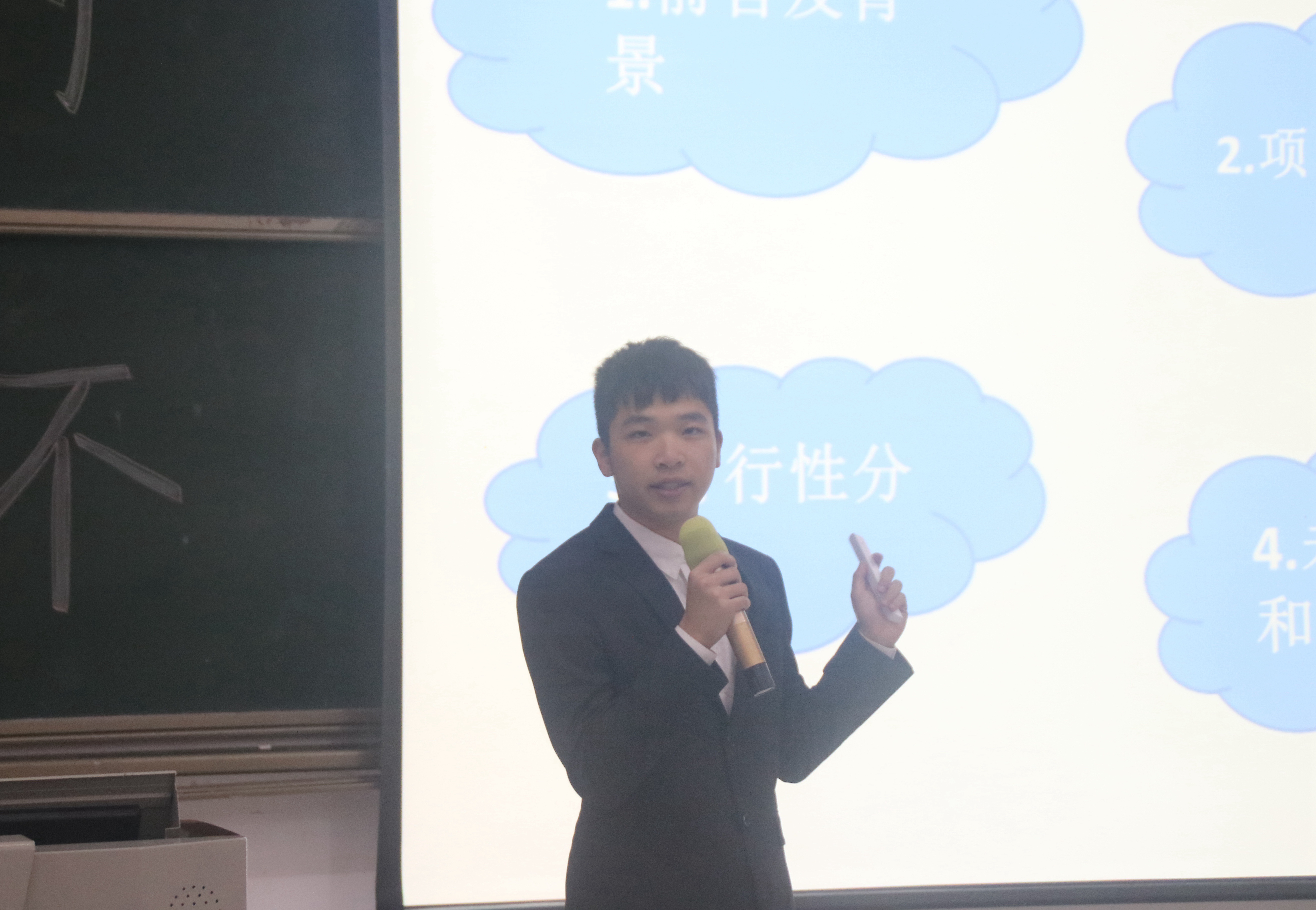在纪检部为比赛公证及主持人介绍比赛规则后,比赛正式拉开了序幕。比赛开始,第一支队伍“五小商家”为我们带来项目介绍。他们以马钢公司为背景,分析该企业存在的主要问题,并针对问题逐一提出解决方案。该组还从国家政策,市场环境方面入手进行可行性分析,再风险评价中抓住三个主体进行剖析,展现了该方案的实行前景。