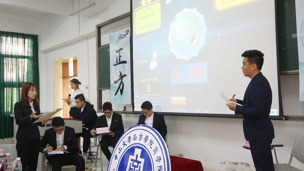 本次比赛由正方市场营销1班与反方金融工程2班就“21世纪青年应当做加法/减法更幸福”辩题展开唇枪舌战。
