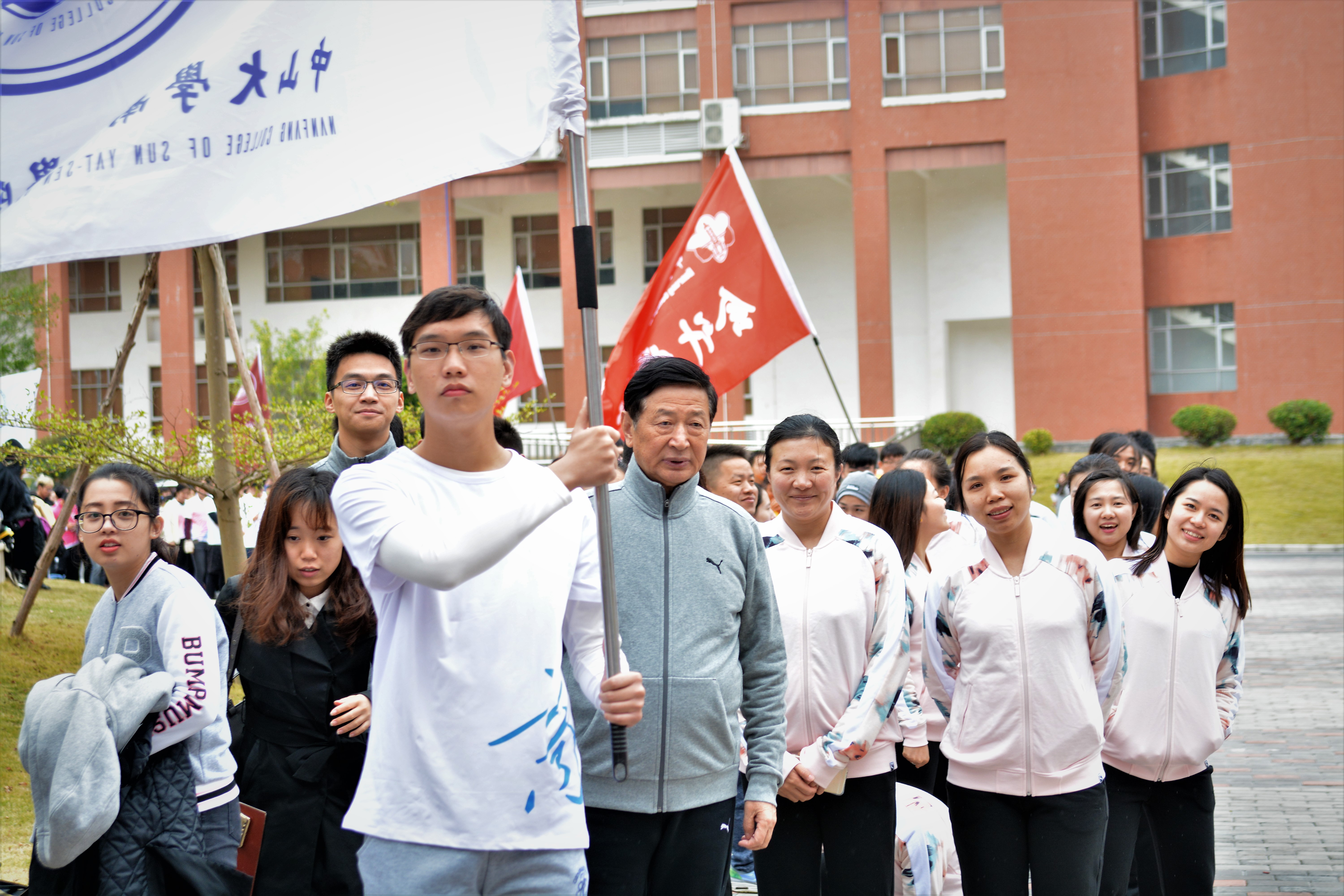 太阳城娱乐队伍出发了,旗手高举院旗,昂首快步,教师队伍跑在队伍前方,信心百倍,员工们位列其后,整齐有序。