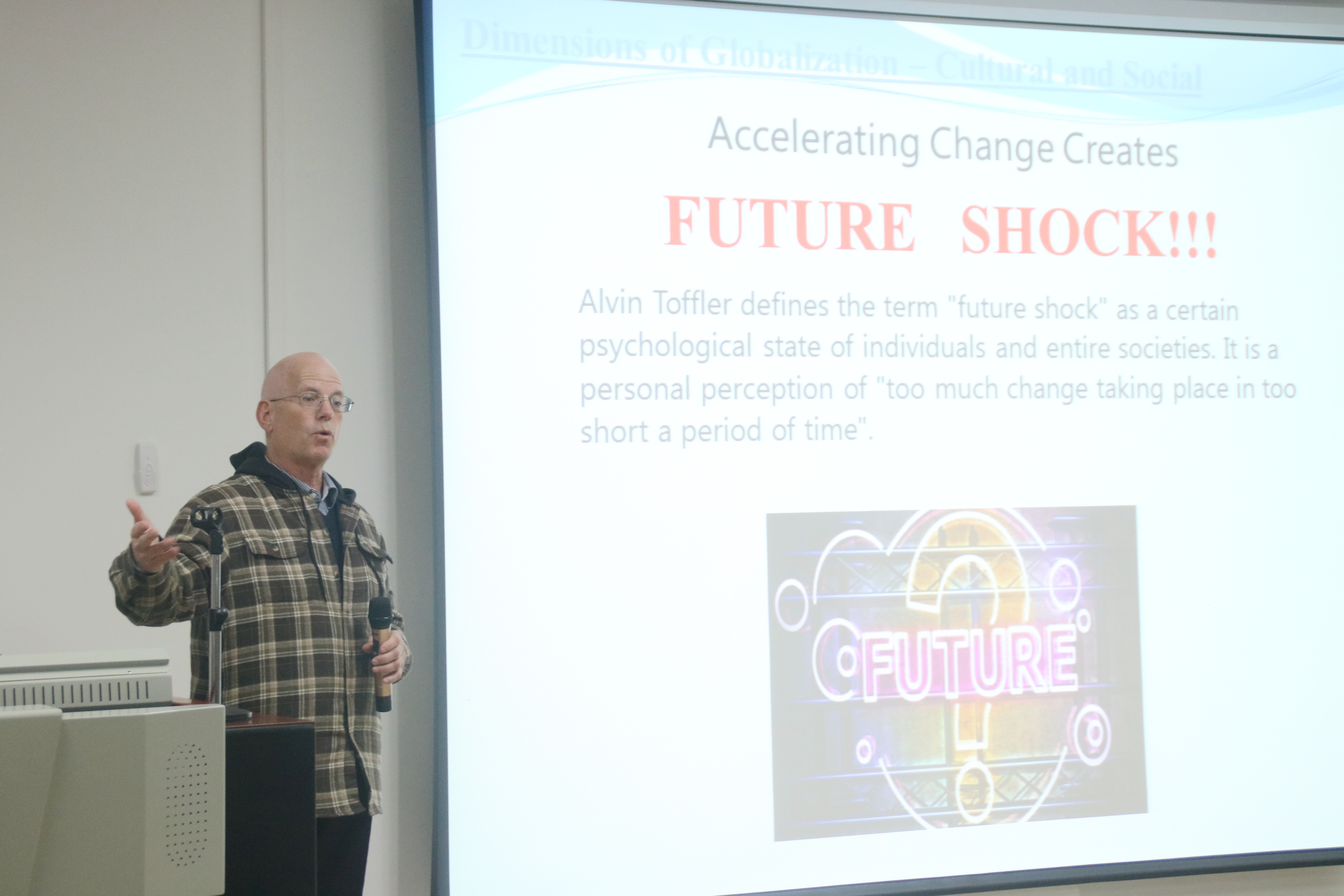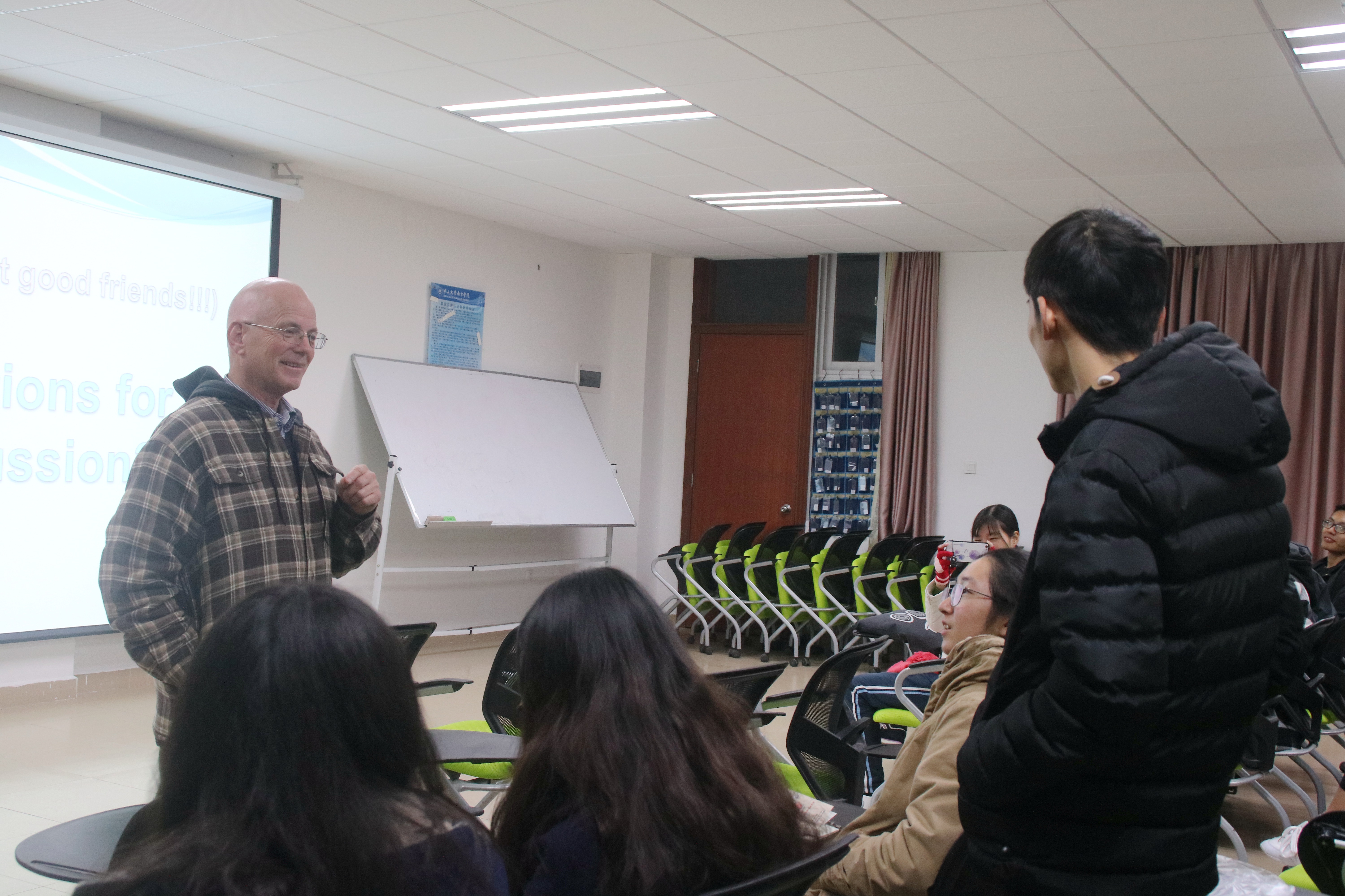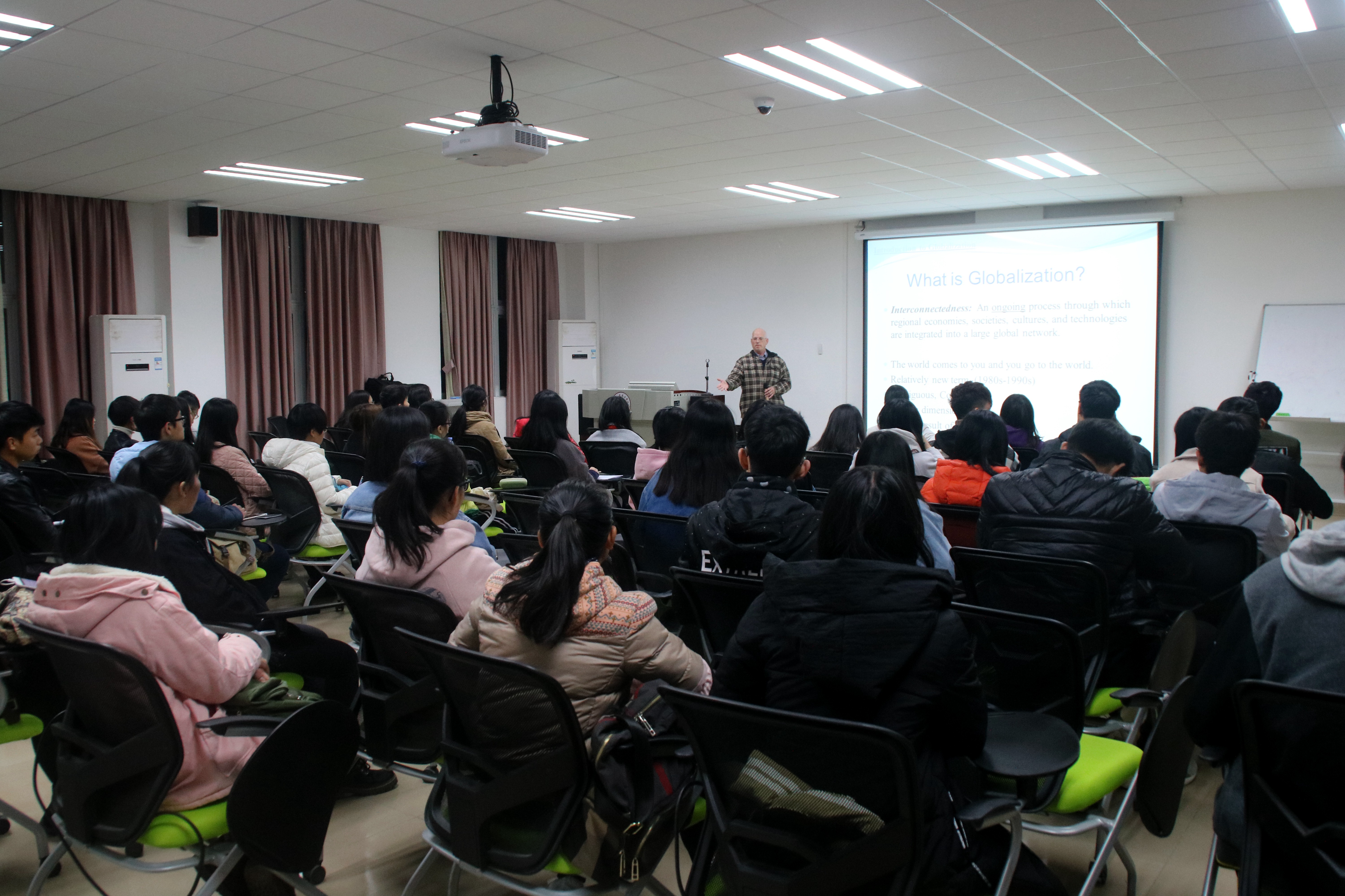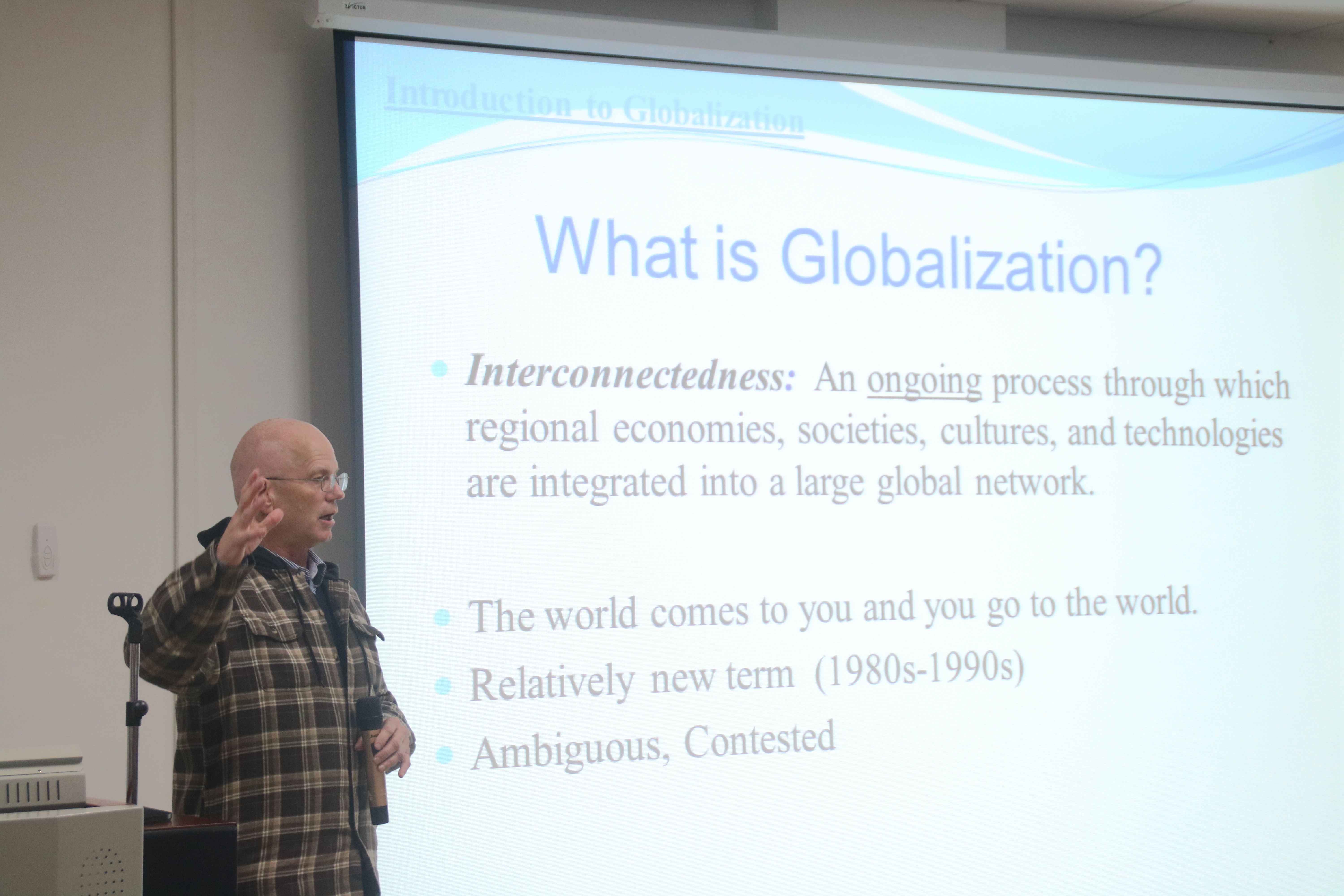 讲座伊始,Daniel K. Marshall教授以全球化的含义即互联性为引入,向大家阐述我们身处世界这个大环境中,世界走向我们,我们也融入了这个世界的现象。与此同时, Daniel K. Marshall教授还讲述了全球化的特征、影响、问题和种类,启发在场的同学们以不同的角度去思考全球化这个浪潮,从而更为深刻理解全球化。