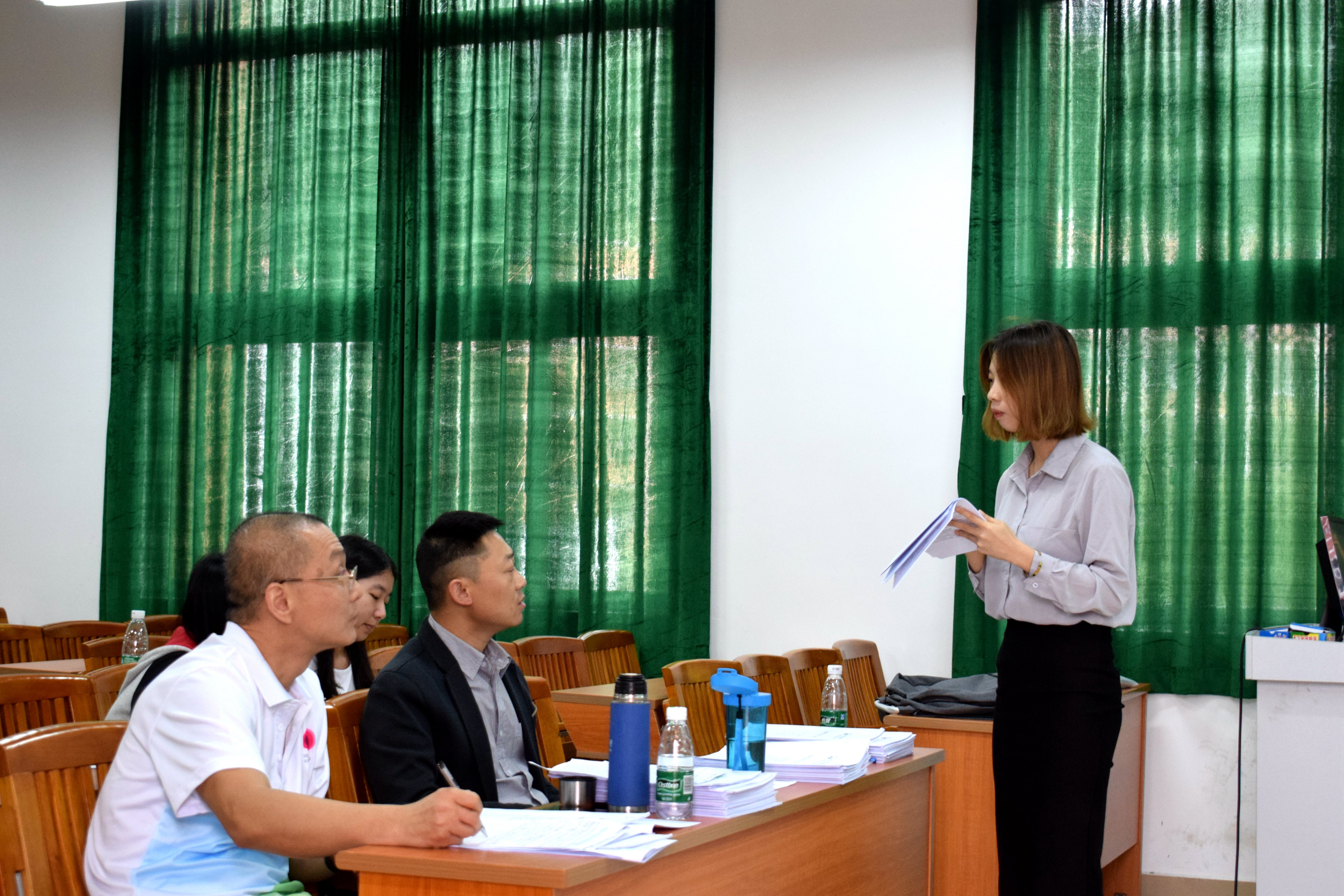 答辩过程分为两大部分:5分钟的论文陈述时间以及5分钟的答辩时间。答辩以PPT展演的形式开展,展演内容涵盖研究背景、选题目的、理论框架、研究方法、建议等方面。老师就员工的论文内容提出有针对性的问题,并进行相应的指导。面对老师的提问与建议,员工皆认真回答、虚心聆听。