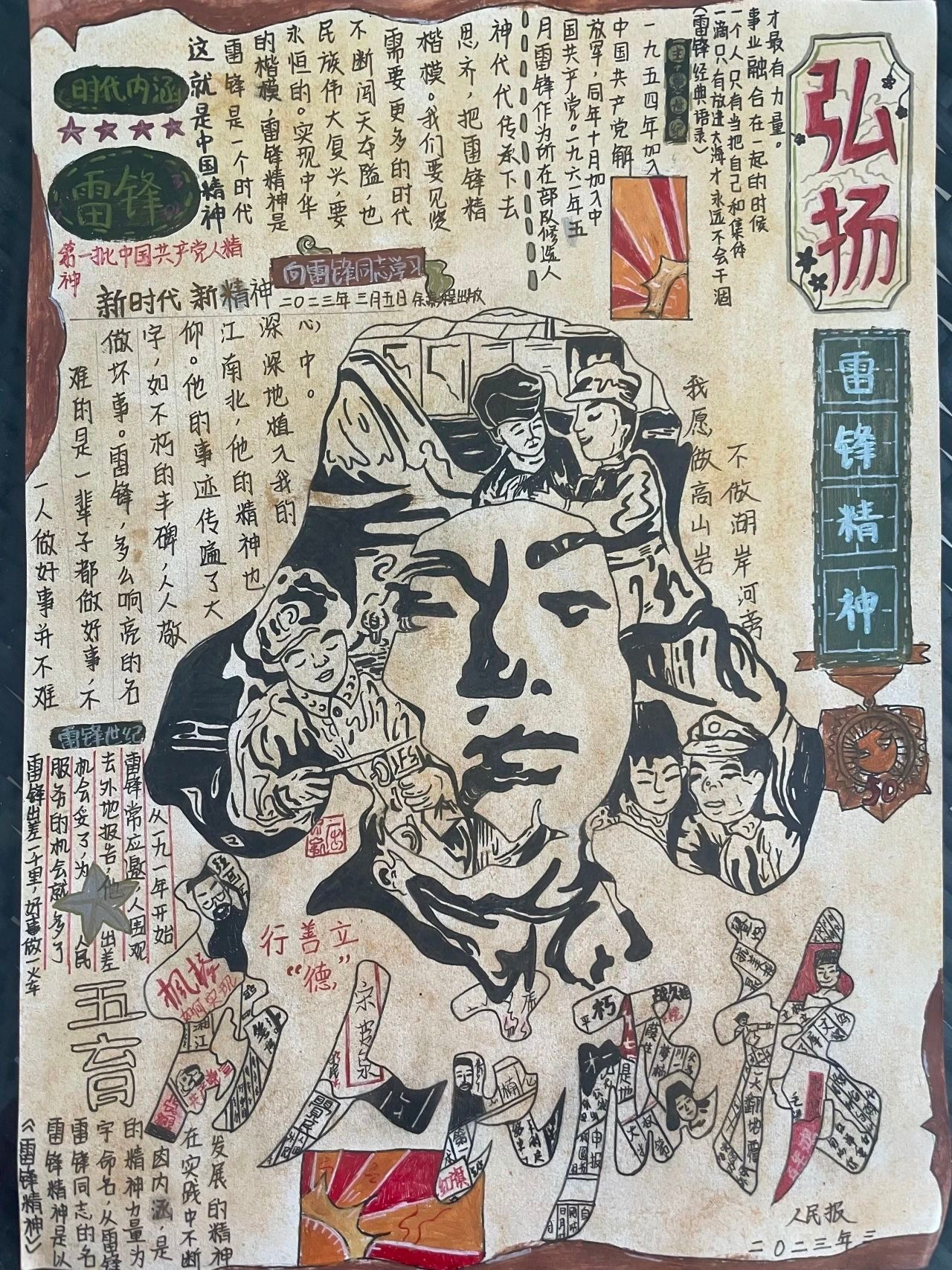 菁菁校园,滴滴朝露。在三月的春风里,通过学雷锋手抄报活动,向同学们传递了雷锋精神。相信雷锋精神可以不断引导同学们在以后的员工、工作和生活中用实际行动传承雷锋高尚的品格,弘扬雷锋珍贵的精神,让校园处处绽放雷锋之花。