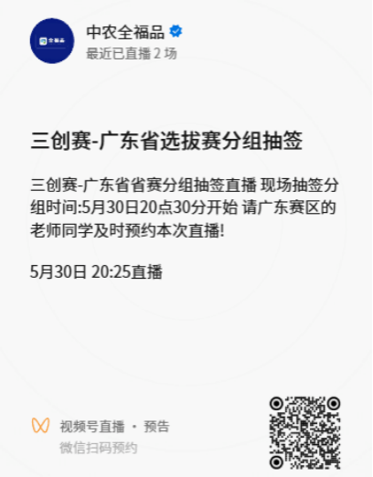 第十五届三创赛广东省选拔赛分组抽签仪式将于5月30日20:30举行,为确保抽签过程的公平、公正与透明,届时会通过“中农全福品”视频号进行全程直播,预约二维码见下图。