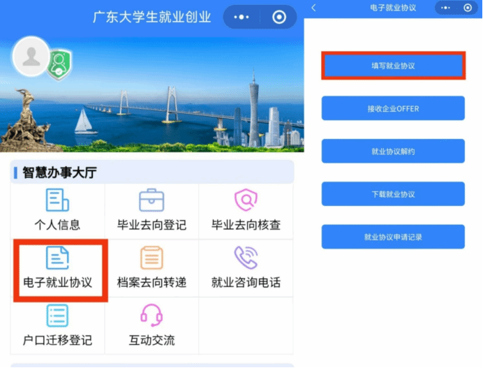打开微信小程序“广东老员工就业创业”,点击图中“电子就业协议”。如提示“学籍绑定”,则先完成学籍绑定。绑定学籍后可进入“电子就业协议”,点击“填写就业协议”。