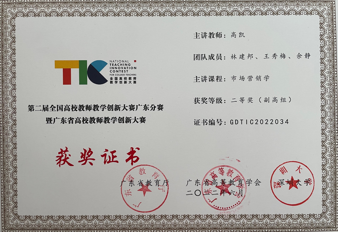 课程建设成果显著,《市场营销学》等2门课程获广东省2020年一流本科课程,《管理学》《市场营销学》2门课程获广东省精品资源共享课,1门课程获批广东省2020年课程思政示范课程,2门课程分获广东省在线教学案例一等奖和二等奖,1门课程案例荣获广东省教育厅本科高校课程思政优秀案例向全省推广与应用。《市场营销学》课程教学团队荣获第二届全国高校教师教学创新大赛广东省二等奖。